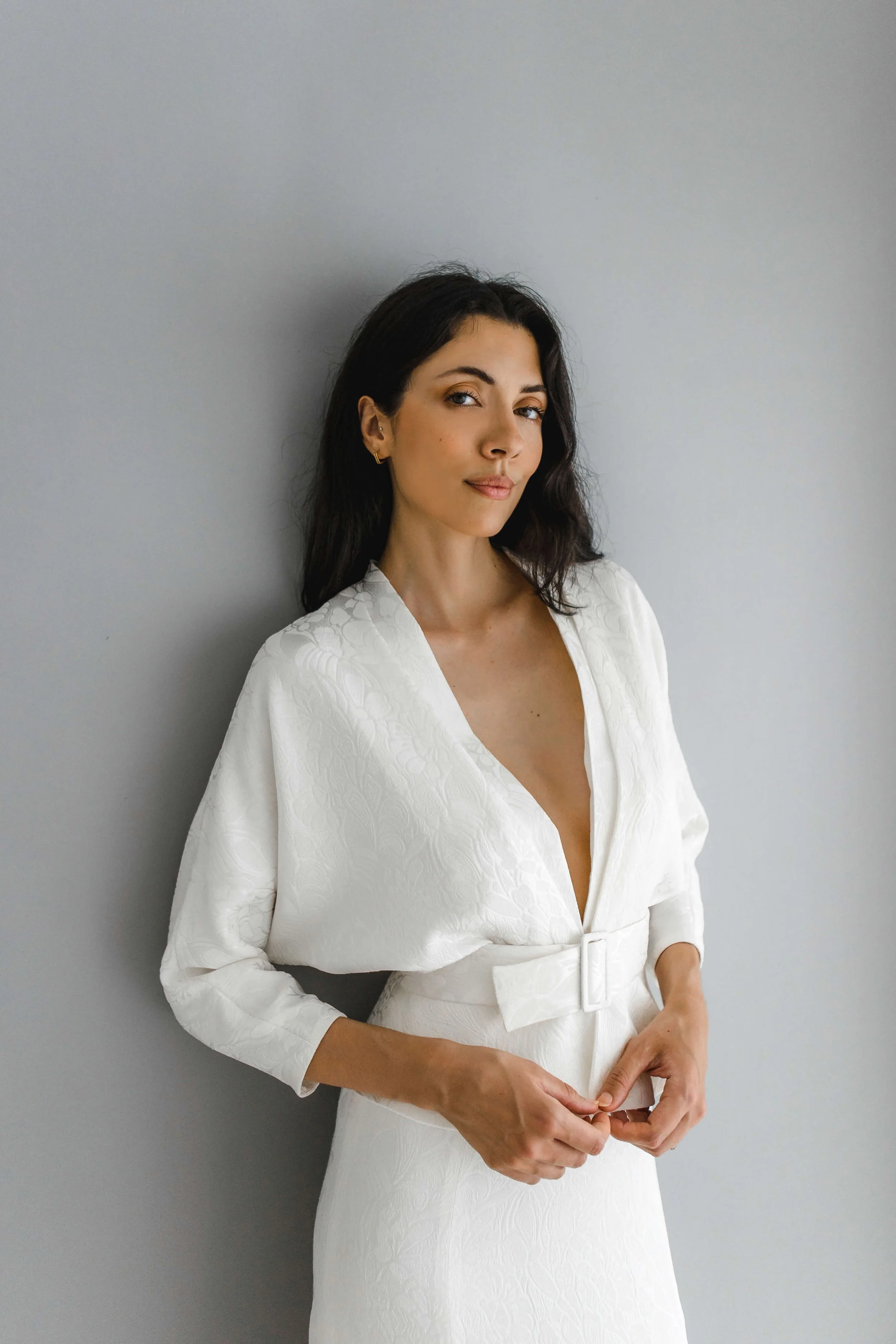Fastens at waist with a single covered button